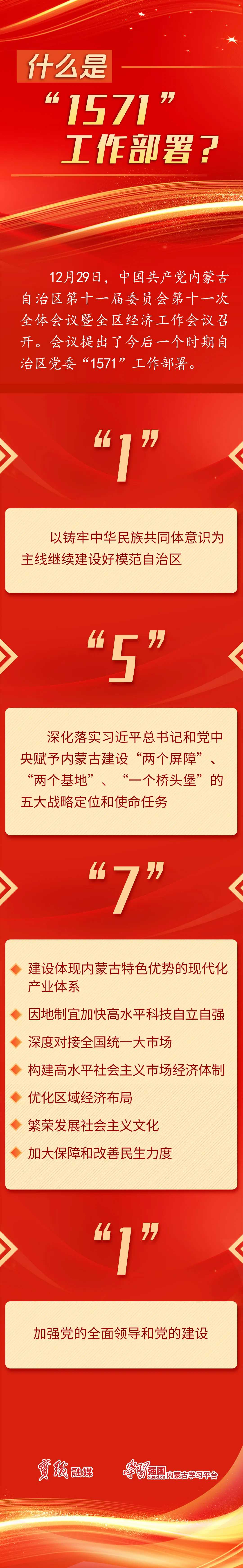 一图读懂自治区党委“1571”工作部署, 中国共产党内蒙古自治区第十一届委员会第十一次全体会议暨全区经济工作会议,于2025年12月29日在呼和浩特举行。 自治区党委常委会深刻领会习近平总书记对内蒙古的殷殷嘱托,深入分析内蒙古发展的阶段性特征,综合各方面意见建议,在过去工作的基础上,形成了今后一个时期自治区党委“1571”工作部署,即以铸牢中华民族共同体意识为主线继续建设好模范自治区,深化落实习近平总书记和党中央赋予内蒙古建设“两个屏障”、“两个基地”、“一个桥头堡”的五大战略定位和使命任务,抓好建设体现内蒙古特色优势的现代化产业体系、因地制宜加快高水平科技自立自强、深度对接全国统一大市场、构建高水平社会主义市场经济体制、优化区域经济布局、繁荣发展社会主义文化、加大保障和改善民生力度七项重点工作,加强党的全面领导和党的建设。内蒙古同全国一道基本实现社会主义现代化的路径更加清晰、抓手更加明确。这些成绩的取得,根本在于以习近平同志为核心的党中央领航掌舵,在于习近平新时代中国特色社会主义思想科学指引,是全区上下共同奋斗的结果。