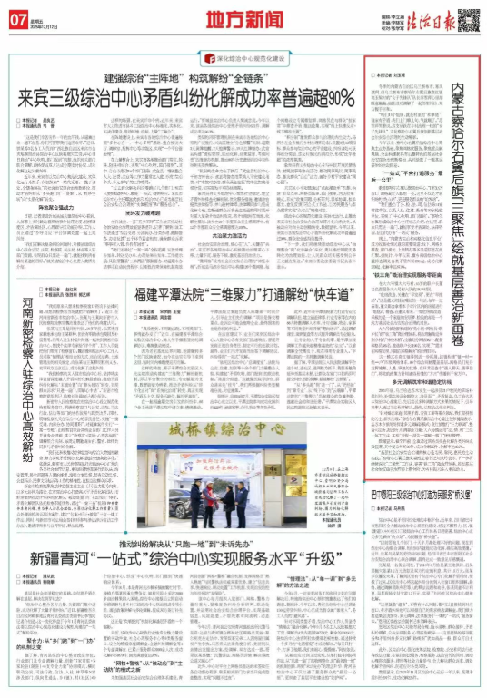 【法治日报】内蒙古察哈尔右翼后旗“三聚焦”绘就基层善治新画卷, 2025年12月12日《法治日报》第7版刊发了《内蒙古察哈尔右翼后旗“三聚焦”绘就基层善治新画卷》的文章,报道了今年以来,察哈尔右翼后旗综治中心聚焦主业夯基础、聚焦网格优服务、聚焦重点解难题,全面构建起具有后旗特色的基层社会治安综合治理新格局,共同绘就了一幅基层善治的生动画卷。报道全文如下:《法治日报》(2025年12月12日07版)冬季的内蒙古自治区乌兰察布市,寒风凛冽,但乌兰察布市察哈尔右翼后旗贲红镇高玉梁村的“女子先锋队”队长苏雪萍心里却暖意融融。她刚成功调解了一起邻里纠纷,双方握手言和。“咱们14个姐妹,就是村里的‘和事佬’,谁家有矛盾,我们上门聊几句,气就顺了。”苏雪萍笑着说。这支活跃在乡村治理一线的“女子先锋队”,正是察哈尔右翼后旗创新基层社会治安综合治理的生动缩影。今年以来,察哈尔右翼后旗综治中心聚焦主业夯基础、聚焦网格优服务、聚焦重点解难题,全面构建起具有后旗特色的基层社会治安综合治理新格局,共同绘就了一幅基层善治的生动画卷。“一站式”平台打通服务“最后一公里”走进察哈尔右翼后旗综治中心,“1室3区N窗口”的格局让人眼前一亮。这里不仅是矛盾纠纷的“终点站”,更是服务群众的“始发站”。“我们整合了公、检、法、司、信访等14家常驻单位,以及人社、住建、教育等30家轮驻单位,实现了‘中心吹哨、部门报到’。”察哈尔右翼后旗综治中心主任杨忠介绍,在这里,群众只需进一扇门,就能享受矛盾调处、法律咨询、信访代办等“一站式”服务。线上,“内蒙古综治和网格化信息平台”成为收集社情民意的重要渠道;线下,网格员排查、窗口接访、上级转办等多渠道信息在此汇聚。据统计,今年以来,旗乡两级综治中心就排查调处各类矛盾纠纷231起,成功化解203起,化解率达87.9%。“铁三角”微治理实现服务零距离在大六号镇大六号村,65岁的联户长董义负责服务大六号村六队的19户村民。“危房改造,关键在‘早发现’,更在‘早推动’。”这是董义常挂在嘴边的一句话,每年一过谷雨,董义都会拿着本子对片区内的房屋进行“地毯式”排查。在董义看来,一处危房的改造,承载的是一个家庭的安居梦,检验的却是一个地方基层社会治安综合治理的成色。大六号镇创新构建的“党小组+网格员+联户长”的“铁三角”微治理体系,将治理触角延伸到乡村的“神经末梢”。全旗划分网格582个,配备网格员585名,推选联户长1190名,实现了“需求在网格发现、问题在网格解决”的治理目标。这一模式在贲红镇得到进一步拓展。该镇构建“镇—村—组—户”四级网格体系,86个综治网格覆盖基层。网格员们充分发挥地熟、人熟、事熟的优势,在日常巡查中“遇人聊天、遇事登门”,将党的政策方针用通俗易懂的“方言”传播到千家万户。多元调解筑牢和谐稳定防线2024年底,乌兰哈达苏木发生一起涉及21户牧民的草场补偿纠纷。补偿款涉及金额较大、涉及面广、矛盾复杂。乌兰哈达苏木综治中心接案后,先后尝试多种调解方式未果的情况下,引导当事人通过司法程序解决。最终,法院依法作出判决。“针对婚恋家庭、邻里矛盾、劳资工薪等重点领域,我们坚持预防为主、源头治理。”察哈尔右翼后旗综治中心副主任彭键闻表示。各苏木乡镇纷纷探索多元调解新模式:贲红镇推行“三力联调”,整合司法所、派出所、村调委会力量;大六号镇运用“法、情、理”三位一体工作法,实现“发现—报告—调解—事了”闭环管理。数据显示,截至目前,全旗通过网格员排查化解各类纠纷成效显著,其中复杂纠纷39件,成功化解35件,化解率达89.7%。“基层社会治安综合治理的核心是为民、靠民、惠民的生动实践。”察哈尔右翼后旗党委政法委书记刘凤玲表示,下一步将继续深化“三聚焦”工作法,完善“铁三角”微治理体系,推动基层社会治安综合治理再上新台阶,为乡村振兴注入更强动力。